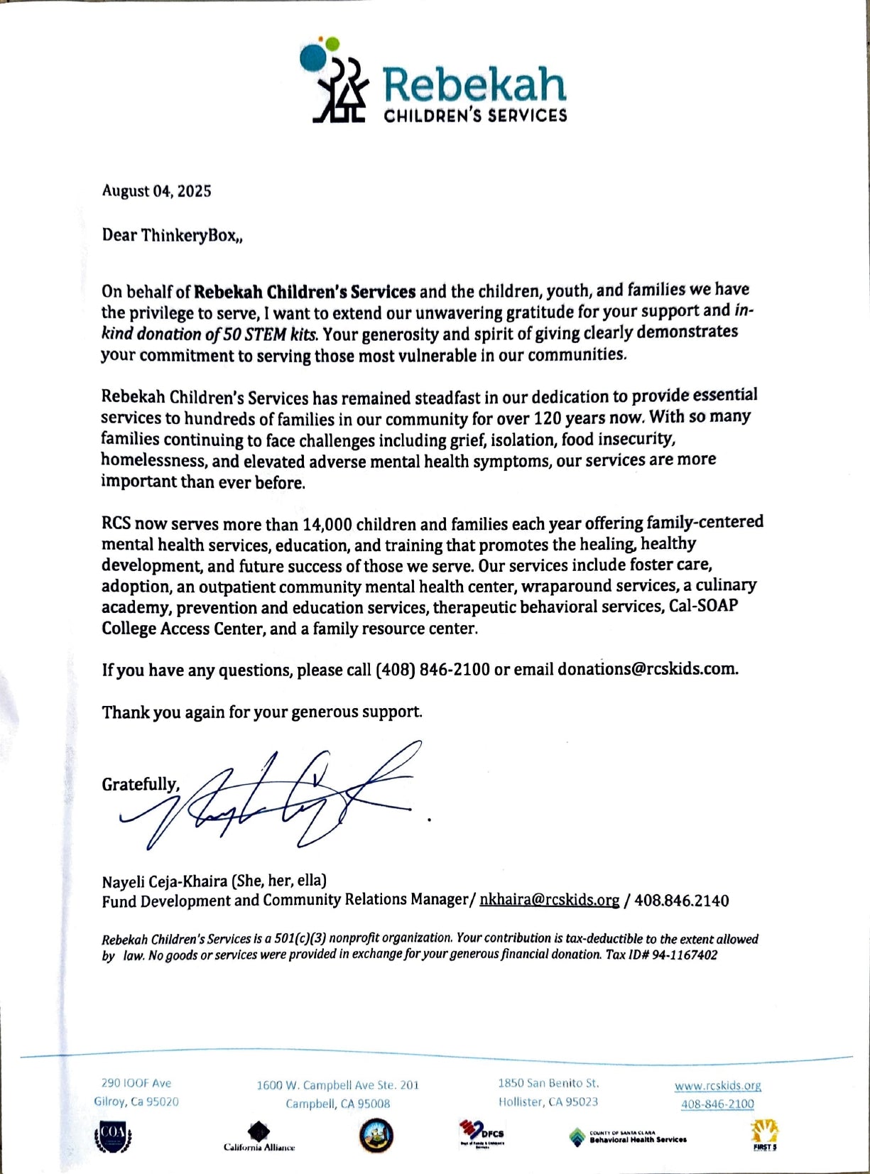 We donated 50 hovercraft kits to Rebekah Children's Services on August 4, 2025. We hope we can continue bringing kits to more kids in need.